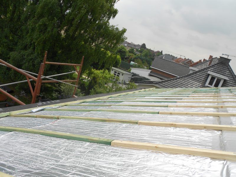 Bij deze werf mocht het dak nietomhoog komen en een isolatie langs de binnenkant was niet mogelijk omdat de zolder reeds afgewerkt was. De dakdekker PRINCEN JEAN VECHMAAL heeft daarom Aluthermo Quattro voorgesteld: de „all-in-one“ oplossing om met een minimum aan ruimteverlies te isoleren.